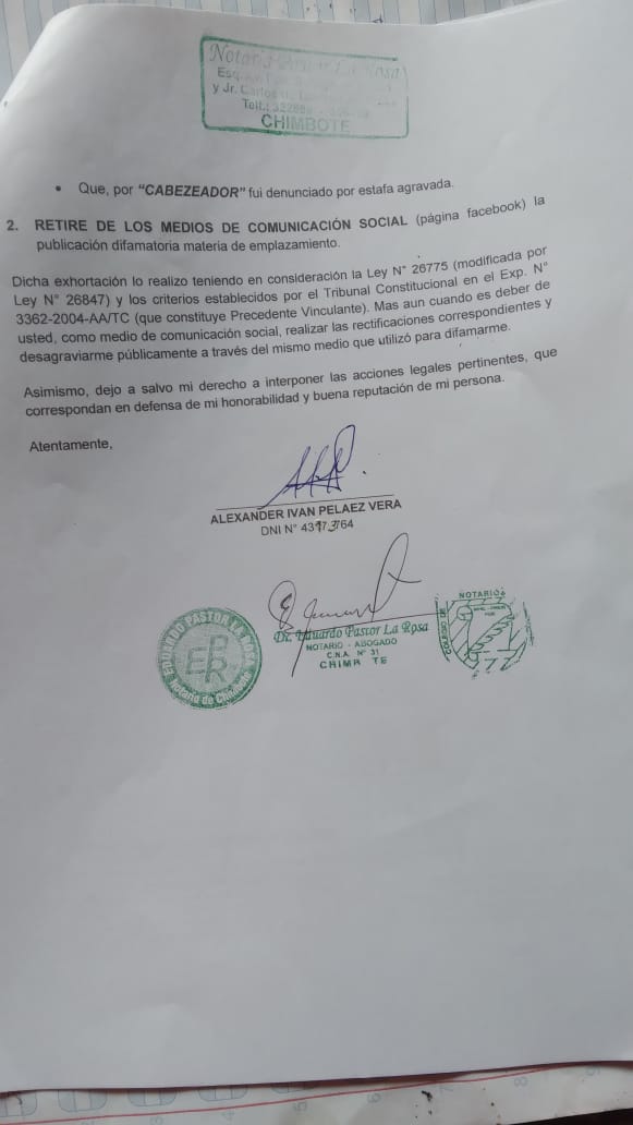 El consejero por la provincial del Santa y virtual candidato a diputado por el partido Somos Perú, Alexander Iván Peláez Vera, cursó una carta notarial al activista social Juan Calderón Altamirano, para que el lapso de 24 horas se rectifique sobre el término “cabeceador” en el Facebook, bajo la amenaza de denunciarlo penalmente por difamación.